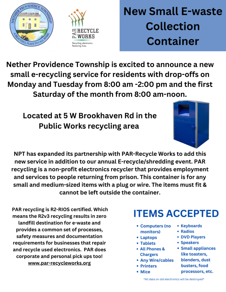 Nether Providence Township has partnered with PAR Recycling to provide residents with a convenient e-recycling collection drop-off container. This initiative supports sustainable practices by offering a simple solution for the responsible disposal of electronic waste.